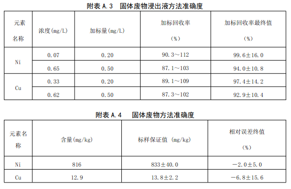 固體廢物浸出液中鎳和銅的方法檢出限分別為0.03mg/L和0.02mg/L,測定下限分別為0.12mg/L和0.08mg/L;當(dāng)試樣質(zhì)量為0.5g、消解后定容體積為50.0ml時(shí),固體廢物中鎳和銅全量測定的方法檢出限分別為3mg/kg和3mg/kg,測定下限分別為12mg/kg和12mg/kg。