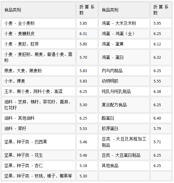 常見(jiàn)食物中的氮折算成蛋白質(zhì)的折算系數(shù)