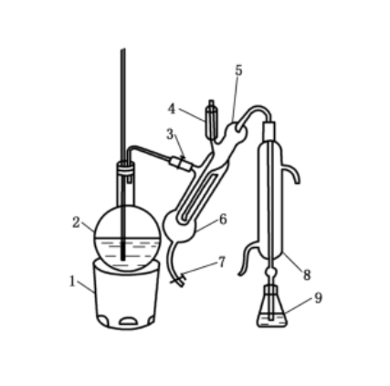 5.1.3 向接收瓶?jī)?nèi)加入10.0 mL硼酸溶液及1滴~2滴混合指示液(B)并保持滿瓶,并使冷凝管的 下端插入液面下,根據(jù)試樣中氮含量,準(zhǔn)確吸取2.0 mL~10.0 mL試樣處理液由小玻杯注入反應(yīng)室,以10 mL水洗滌小玻杯并使之流入反應(yīng)室內(nèi),隨后塞緊棒狀玻塞。將10.0 mL氫氧化鈉溶液倒入小玻杯,提起玻塞使其緩緩流入反應(yīng)室,立即將玻塞蓋緊,并加水封。夾緊螺旋夾,開(kāi)始蒸餾。蒸餾10 min 后移動(dòng)蒸餾液接收瓶,液面離開(kāi)冷凝管下端,再蒸餾1 min。然后用少量水沖洗冷凝管下端外部,取下蒸餾液接收瓶。以硫酸或鹽酸標(biāo)準(zhǔn)滴定溶液滴定至終點(diǎn),如用A混合指示液,終點(diǎn)顏色為灰藍(lán)色;如用B混合指示液,終點(diǎn)顏色為淺紅色。同時(shí)做試劑空白。