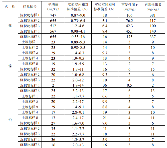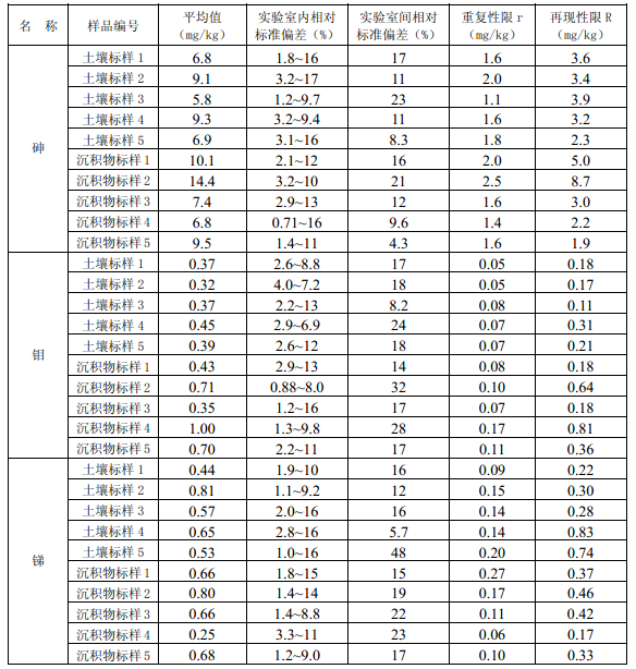 11.3 每批次樣品至少按10%的比例進(jìn)行平行雙樣測(cè)定,樣品數(shù)量少于10個(gè)時(shí),應(yīng)至少測(cè)定一個(gè)平行雙樣。平行雙樣測(cè)定結(jié)果中,電熱板消解測(cè)定鈷(Co)、銅(Cu)、鉻(Cr)、錳(Mn)、鎳(Ni)、鉛(Pb)、鋅(Zn)、釩(V)、砷(As)的相對(duì)偏差應(yīng)小于30%,鎘(Cd)、鉬(Mo)、銻(Sb)的相對(duì)偏差應(yīng)小于40%;微波消解測(cè)定12種金屬元素的相對(duì)偏差應(yīng)小于30%。
