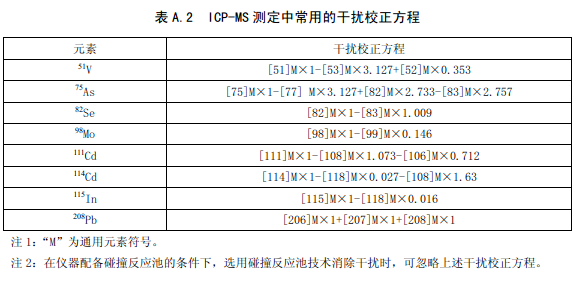 A.1給出了ICP-MS測(cè)定中常見(jiàn)的多原子離子干擾,表A.2給出了常用的干擾校正方程。