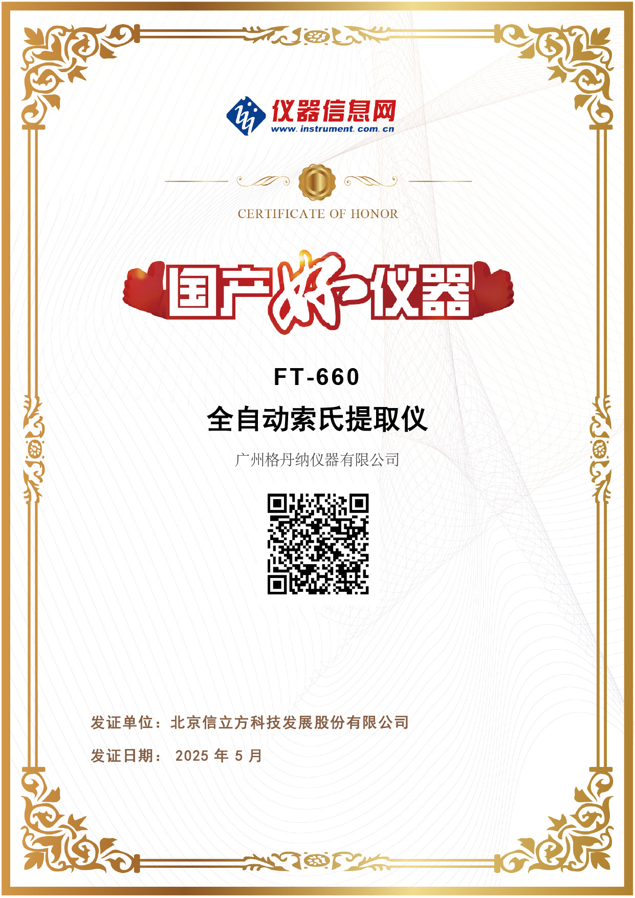 獲得《格丹納榮獲“國產(chǎn)好儀器”稱號-全自動索氏提取儀》