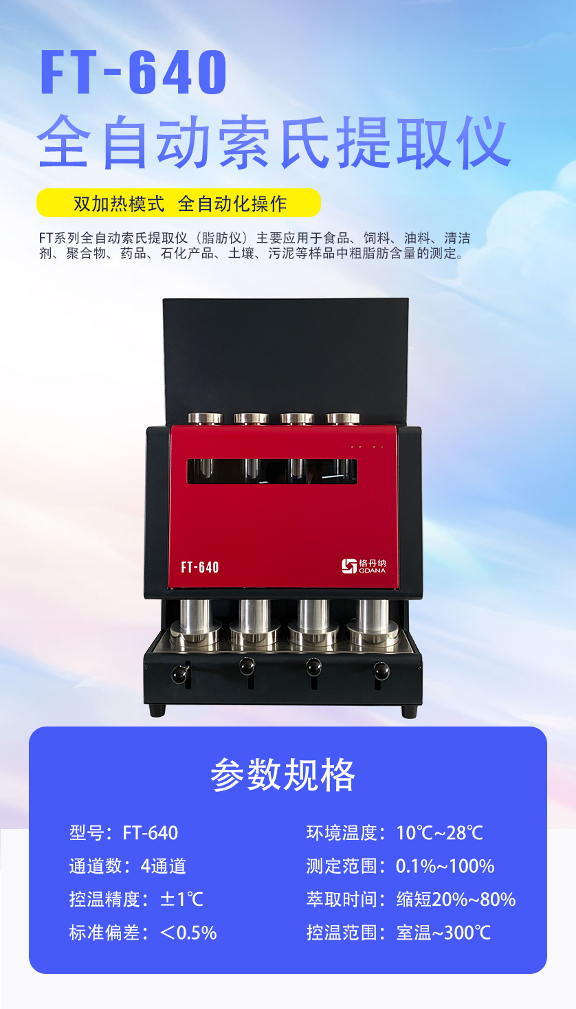 FT640索氏提取自動脂肪儀主要應(yīng)用于食品、飼料、油料、清潔劑、聚合物、藥品、石化產(chǎn)品、土壤、污泥等樣品中粗脂肪含量的測定。