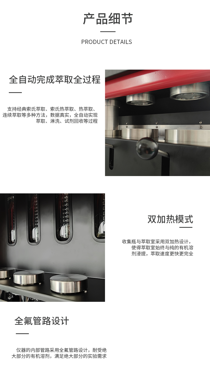 02 >實現(xiàn)全程熱浸泡萃取,收集瓶與萃取室雙加熱,萃取速度快,比傳統(tǒng)索氏提取法縮短20%~80%提取時間