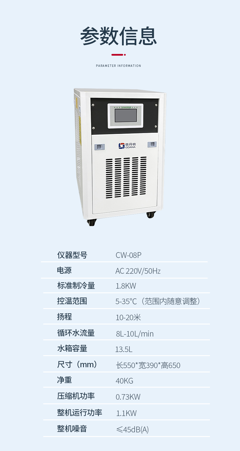 冷水機制冷系統將水箱內的水冷卻,而后機器內部的水泵把低溫的水注入需要冷卻的設備內。水帶走機器內部的熱量,變成高溫的水后回流到水箱進行降溫,如此循環(huán)交換冷卻,起到為設備冷卻的作用。