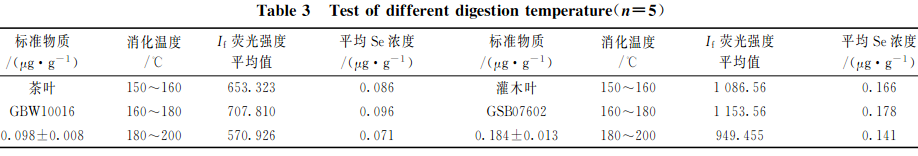 準(zhǔn)確稱取2.0g(精確至0.0001g)植物標(biāo)樣茶葉(GBW10016)樣品和灌木葉(GSB07602)樣品各15份,分3組,每組5次重復(fù)稱樣,以2.2中HNO3+HClO4(V+V)(8+2)mL混酸比溶液進(jìn)行消化處理,再以不同的消解溫度進(jìn)行消化處理,測(cè)試硒的相對(duì)熒光值,結(jié)果見表3。