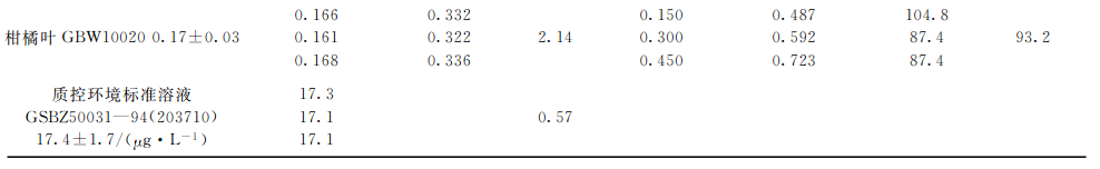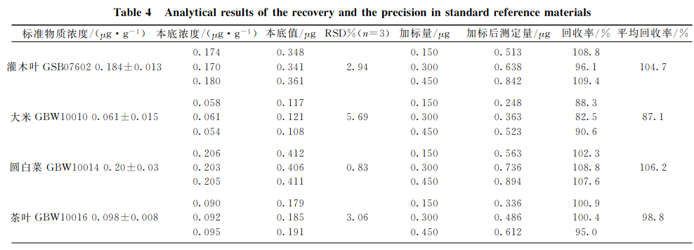 分別選取灌木葉、大米、圓白菜、茶葉和柑橘葉五種植物標(biāo)準(zhǔn)樣品,每種重復(fù)3次準(zhǔn)確稱取2.0g(精確至0.0001g),按上述實(shí)驗(yàn)條件進(jìn)行消解,測(cè)定本底值。再對(duì)每種植物標(biāo)樣稱取子樣,每種重復(fù)3次準(zhǔn)確稱取2.0g(精確至0.0001g),此次每種試樣中分別加入1.0mg?L-1硒標(biāo)準(zhǔn)溶液150,300,450gL,進(jìn)行消解并測(cè)定加標(biāo)后值,同時(shí)測(cè)定硒質(zhì)控環(huán)境標(biāo)準(zhǔn)溶液(GSBZ50031-94(203710)),結(jié)果見表4。可見,硒標(biāo)準(zhǔn)加標(biāo)回收率在87.1%~106.2%之間,精密度(n=3)在0.83%~5.69%之間,所測(cè)結(jié)果均與標(biāo)準(zhǔn)物質(zhì)的參考值吻合,完全達(dá)到分析要求。