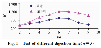 準(zhǔn)確稱取2.0g(精確至0.0001g)植物標(biāo)樣茶葉(GBW10016)樣品和灌木葉(GSB07602)樣品各24份,分8組,每組3次重復(fù)稱樣,以2.2中HNO3+HClO4(V+V)(8+2)mL混酸比溶液,以表3中的160~180C為消化溫度,分別設(shè)定8組消化時(shí)間為2,3,4,5,6,7,8,9h,測(cè)試硒的相對(duì)熒光值,結(jié)果見圖1。