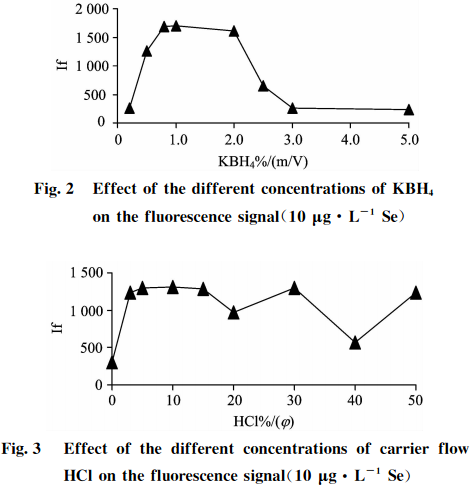 在儀器條件不變的情況下,測(cè)試10Hg?L-的Se標(biāo)準(zhǔn)溶液隨載流HCl和還原劑KBH4濃度變化對(duì)硒熒光強(qiáng)度的影響,結(jié)果見圖2和圖3。可知,當(dāng)載流HCl和還原劑KBH4濃度低時(shí)熒光強(qiáng)度低,信號(hào)靈敏度差,說明還原能力弱;當(dāng)載流HCl和還原劑KBH41濃度增大時(shí),熒光強(qiáng)度也隨之增強(qiáng);當(dāng)兩者濃度太高時(shí),反應(yīng)產(chǎn)生的氫氣多,泡沫都易沖入管道,熒光強(qiáng)度反而會(huì)降低,這是由于過量的氫氣稀釋了火焰中硒原子蒸氣造成的。實(shí)驗(yàn)結(jié)果表明:對(duì)于10pg?L1的Se標(biāo)準(zhǔn)溶液,還原劑KBH4濃度在0.8%~2.0%(m/V)之間,載流HC1濃度在4%~15%(g)之間,火焰平穩(wěn),熒光值達(dá)到穩(wěn)定,信噪比和靈敏度高。綜合考慮選擇還原劑濃度為1.0%KBH4(m/V)+0.5%KOH(m/V),載流HC1為10%(g)。