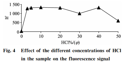 品消化過程的酸度確保了Se+還原成Se+,上機(jī)測(cè)試前樣品經(jīng)稀釋后制備液酸度也會(huì)影響硒的測(cè)定結(jié)果。分別吸取100gg?L-標(biāo)準(zhǔn)應(yīng)用液5.0mL于7個(gè)50mL的具塞比色管中,分別加入0.0,1.5,2.5,5.0,10.0,15.0,20.025,0mL濃HCl,用純水稀釋定容至刻度,用以制備不同酸度的10gg?L硒標(biāo)準(zhǔn)溶液,以2.4中的載流和還原劑濃度進(jìn)行上機(jī)測(cè)定,結(jié)果見圖4??芍?扣除空白后,HCl(g)在3%~20%范圍內(nèi),10gg?L-1硒標(biāo)準(zhǔn)溶液具有較強(qiáng)且穩(wěn)定的熒光強(qiáng)度;當(dāng)樣品HCl(q)>20%時(shí),硒熒光值受到抑制且不穩(wěn)定,考慮到樣品酸度的提高有利于硒的還原,同時(shí)可以減少共存元素的干擾,故本方法選用15%HCl(g)酸度作為樣品和標(biāo)準(zhǔn)溶液上機(jī)測(cè)試時(shí)制備液的酸度,才能保證測(cè)量的穩(wěn)定性和一致性。