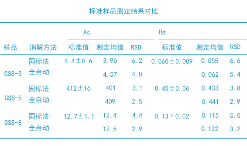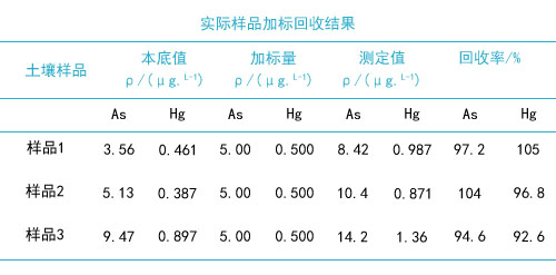 對(duì)3份實(shí)際土壤樣品加標(biāo),結(jié)果見下表。由表中可知,全自動(dòng)石墨消解法處理樣品,砷和汞的加標(biāo)回收率分別為94.6%~104%和92.6%~105%。試驗(yàn)說明,該方法測(cè)定土壤中的砷和汞,準(zhǔn)確度和精密度均能滿足質(zhì)量控制的要求。