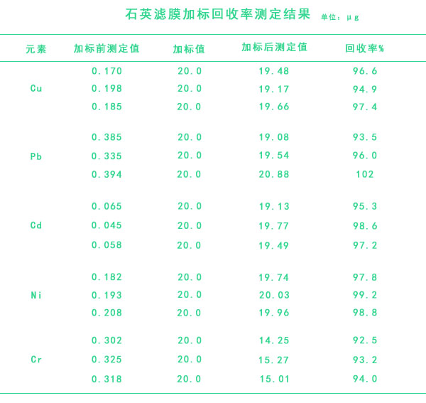 石英濾膜加標回收率測定結(jié)果
