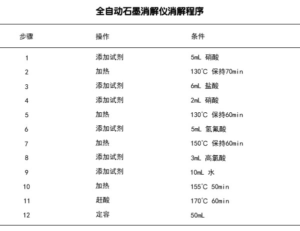 準(zhǔn)確稱取0.50g樣品,放置聚四氟乙烯消解管中,然后插入全自動(dòng)石墨消解儀石墨孔中,加入5mL硝酸,加熱到130℃,維持70min;加入6mL鹽酸、2mL硝酸,130℃加熱60min;加入5mL氫氟酸,加熱到150℃,維持60min,加入3mL高氯酸、10mL純水,加熱到155℃,維持50min,后趕酸,并自動(dòng)定容至50mL,搖勻待測(cè)。(具體全自動(dòng)消解儀消解程序見(jiàn)下面表格)。同時(shí)進(jìn)行試劑空白試驗(yàn)。