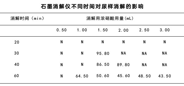 經(jīng)過實驗優(yōu)化得出:2.50mL尿液于消化管中,分別加入0.50—3.00mL的濃硝酸,于石墨消解儀中分別消解20~60min。結(jié)果顯示,以1.50mL的濃硝酸消解30min的回收率高。