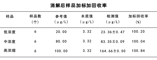 取空白試管18支,分為3組,每組6支,每組分別加入質(zhì)量濃度為50mg/L的錫標(biāo)準(zhǔn)儲備液0.01、0.04和0.08mL,隨后以尿液定容至2.50mL,配制成錫質(zhì)量濃度分別為200.00、800.00和l600.00μg/L的低、中、高質(zhì)量濃度尿液樣品,按照上面的方法采用石墨消解儀進(jìn)行消解并稀釋10倍,1d內(nèi)測定完畢,計算加標(biāo)回收率和精密度結(jié)果如下表。