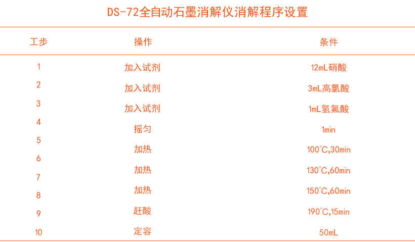 加入12mL硝酸+3mL高氯酸+1mL氫氟酸,搖勻1min,然后程序自動升溫至100℃,保持30min,此時消解管中有濃重的紅棕色煙霧冒出,繼續(xù)消解樣品將溫度升溫至130℃,保持60min,溫度升溫至150℃,保持60min,到時的樣品應(yīng)該消解至淡黃色澄清透明狀態(tài),全自動石墨消解儀升溫至190℃,保持15min進(jìn)行趕酸,趕酸完全后使用超純水定容至50mL待測。同時做空白樣試樣。