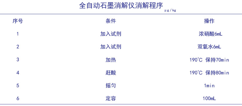 《中國藥典》中有規(guī)定了中藥中鉛、鎘、砷、汞、銅的檢測方法,對于沙星類抗生素中的其它金屬元素殘留未作規(guī)定。本文采用全自動(dòng)石墨消解儀酸消解方法對樣品進(jìn)行前處理消解,測定左氧氟沙星膠囊中鉛、鉻、砷、鎘、錫、鋁、鐵7大金屬元素含量。消解儀高程度自動(dòng)化消解,操作簡單、批處理量大,解放人力繁瑣操作,大大提高工作效率。