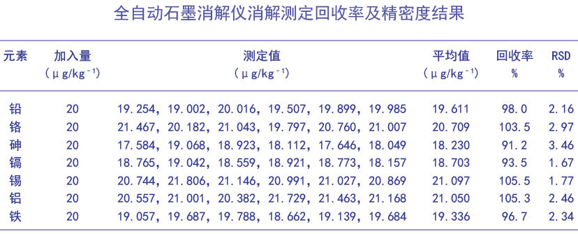 驗(yàn)證消解方法的回收率與精密度,稱取約0.2g,然后按上面的消解方法進(jìn)行樣品處理,進(jìn)行6次平行測定回收率及方法精密度結(jié)果如下:
