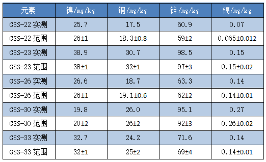 實(shí)驗(yàn)發(fā)現(xiàn)除GSS-23的銅元素檢測值略低于不確定度范圍, GSS-30的鋅元素檢測值略高于不確定度范圍,其余樣品的四類元素檢測結(jié)果均在標(biāo)準(zhǔn)值不確定度范圍之內(nèi),滿足實(shí)驗(yàn)室土壤檢測實(shí)驗(yàn)的要求。