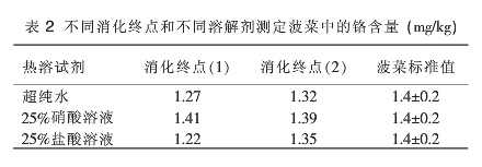 表2給出各個不同消化終點和不同熱溶試劑處理組菠菜標準物質(zhì)(GBW10015)中鉻含量。兩種消化終點試驗樣品中加入不同熱溶試劑的測定結(jié)果都在菠菜標準物質(zhì)參考值范圍內(nèi)。兩組數(shù)據(jù)進行95%置信區(qū)間檢驗,計算結(jié)果為8.66-<F(9.28),表明兩組試驗結(jié)果無顯著性差異。將以上備用液放置1d后再進行上機測定,發(fā)現(xiàn)使用超純水和 25%鹽酸溶液溶解的兩組結(jié)果都出現(xiàn)明顯下降,偏離了參考值下限。而用25%硝酸溶液溶解的備用液結(jié)果雖有下降,但不顯著。綜上表明,消化近干后用25%硝酸熱溶的預處理方法佳。